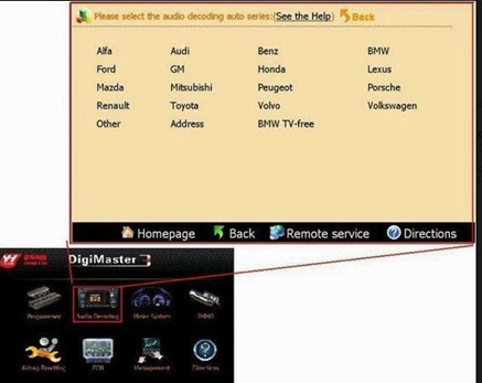 Digimaster III mileage programmer can calculate the audio code out or initialize it. The following list of vehicle makes all support audio decoding function (Here we take Benz as an example).